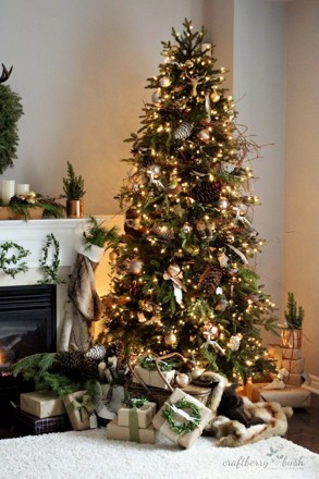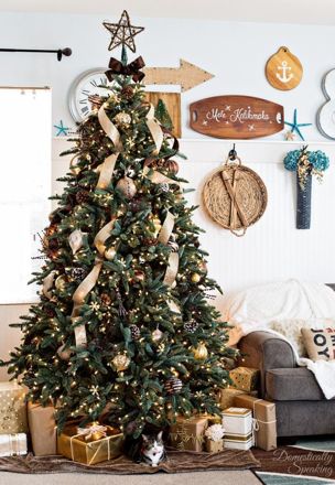 Rusztikus karácsonyfa, melyen az arany díszek mellett a természetes elemek dominálnak. Tobozok és gallyak is szolgálhatnak díszként egy fán.