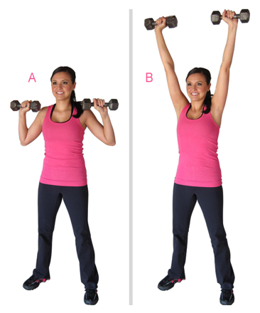 Állj vállszéles terpeszben, fogd meg a kézi súlyzót és mindkét kezedet emeld a fejed fölé. A tested mellett vezetve húzd le kezedet úgy, hogy hátul megpróbálod zárni a lapockád. Ismételd 3x10