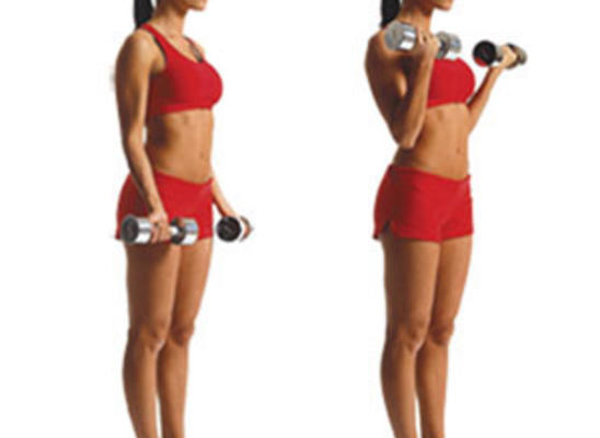 Fogj két egykezes súlyzót, és állj vállszéles terpeszbe. A kezed lógjon a tested mellett. Húzd fel az alkarod mell magasságig úgy, hogy a könyököd a tested mellett marad, nem mozdul el. Ismételd 3x10