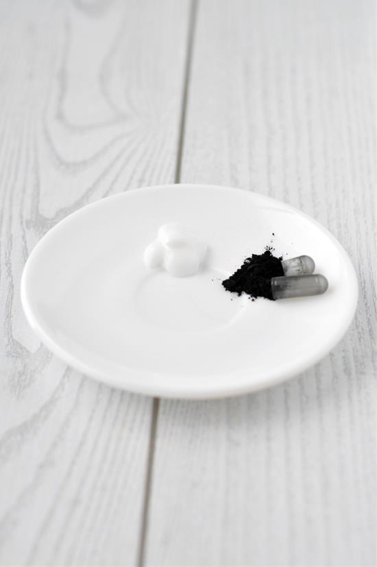 1. Nyisd ki az aktív faszén kapszulát és óvatosan öntsd a tartalmát egy kis tányérra.