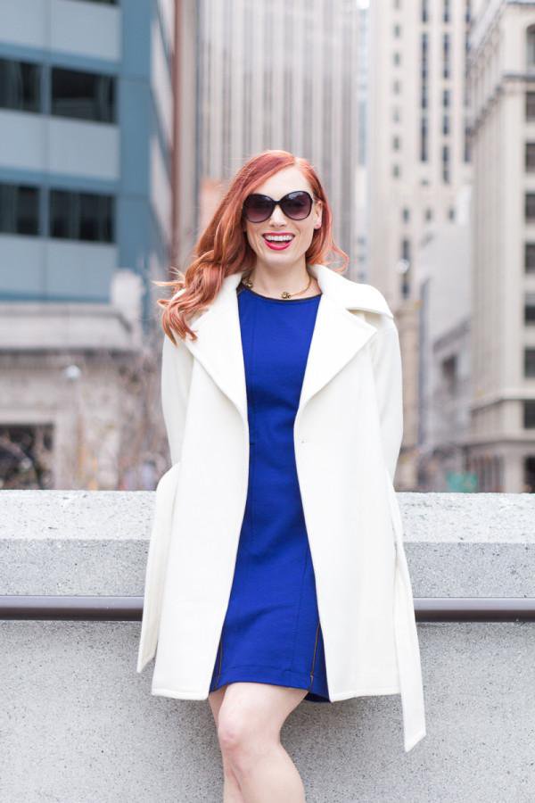 A fekete és a sötét színek helyett vásárolj vidám színű ruhákat. Például ez a nőies kék ruha nem lenne ilyen elegáns a világos kabát nélkül.