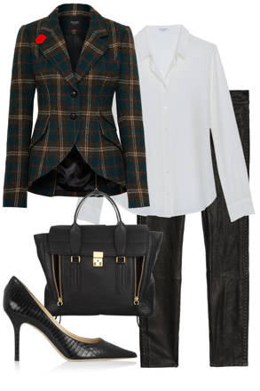 A blézer és a fehér ing biztosít elegendő eleganciát a bőrnadrágnak ahhoz, hogy munkába is felvegyük.