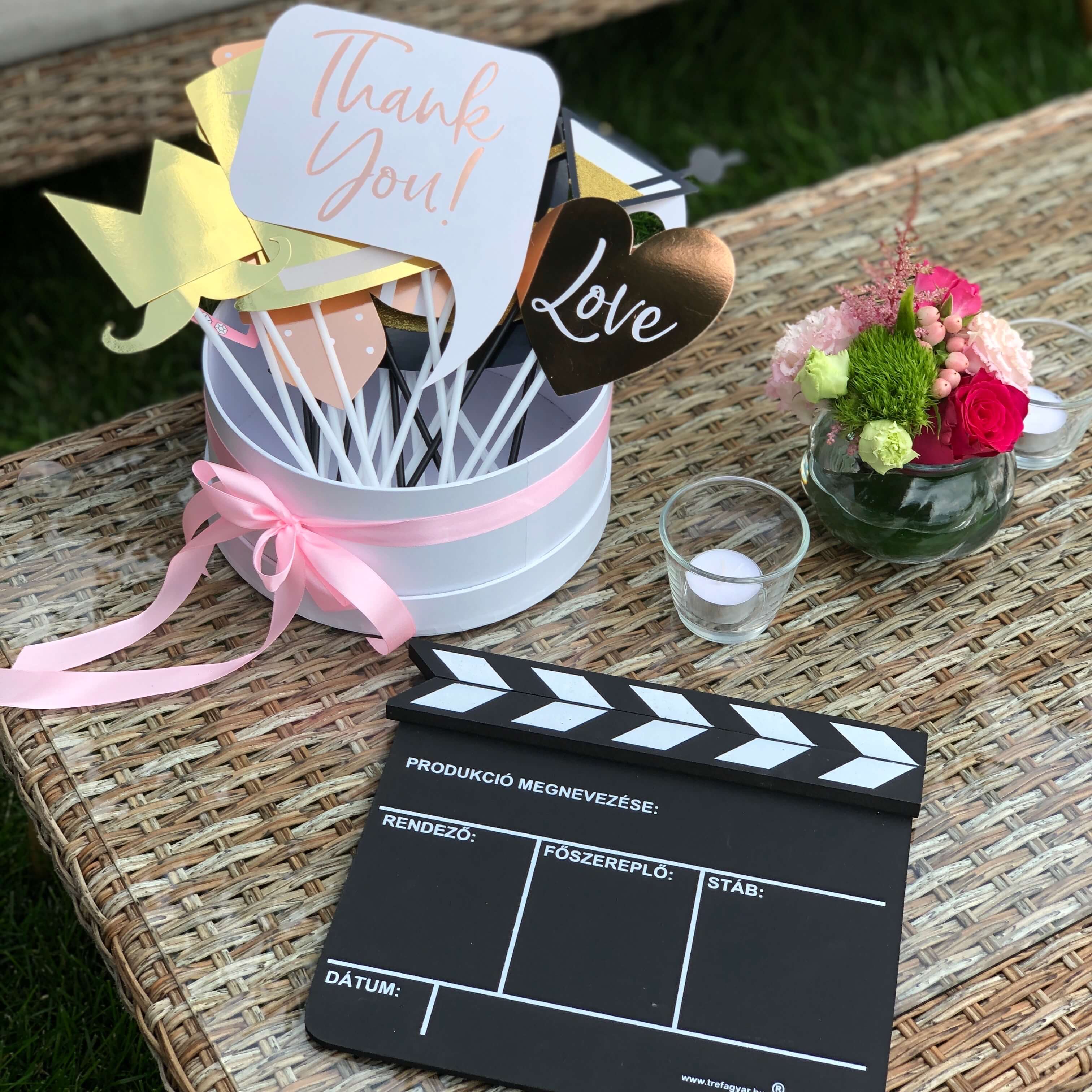 A fal mellé egy asztalkára szoktam készíteni vicces feliratokat, kellékeket, melyekkel a vendégek pózolhatnak. A friss házaspár “Mr és Mrs” vagy „Just Married” táblácskával, a vendégek pedig vicces feliratokkal, bajusszal, napszemüveggel, vagy nyakkendővel fotózkodhatnak. Ezek a kis geg-táblácskák egyrészt jól jönnek, ha valaki nem tud mit kezdeni a kezeivel, másrészt humorral oldják a hangulatot, így őszintébbek lesznek a mosolyok is.