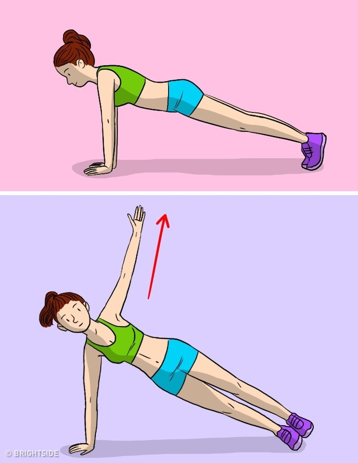 Ereszkedj nyújtott plank pozícióba és feszítsd be a farizmaidat. Fordítsd ki a tested balra egészen addig, míg oldalsó plank pozícióba nem érkezel. Ez után emeld fel a bal karodat és nyújtsd ki magad felett úgy, hogy párhuzamos legyen a testedet támasztó karoddal. Ez után ereszd le a karodat, majd ismételd el a gyakorlatot a másik oldaladon is. Oldalanként 10-10 emelést csinálj.