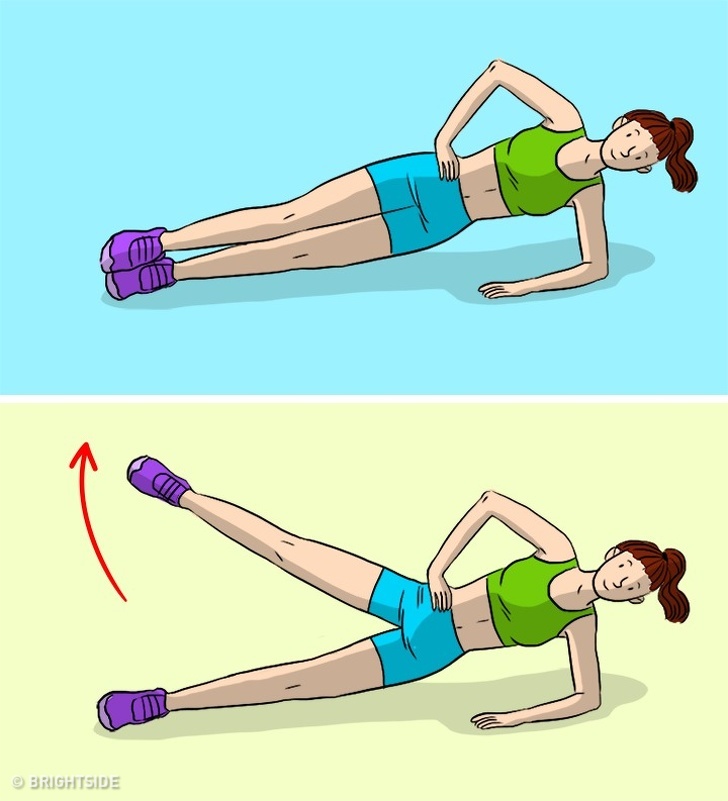 Ereszkedj oldalsó könyékplankbe. Emeld fel a fenti lábadat, hogy lábaid V-alakot formáljanak, majd ereszd le. Végig ügyelj rá, hogy lábujjaid előrefelé mutassanak. Ha kész van 10 emelés, jöhet a másik oldal.