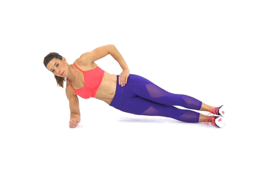 Kezdésnek vegyél fel egy könyöklő oldal plank pózt – a támaszkodó karod válla pontosan a könyököd felett helyezkedjen el. Ha ez túl nehéznek bizonyul, akkor az alsó térdedet is a padlóra helyezheted. Tartsd meg ezt a pózt 30 másodpercig, és amikor úgy érzed, hogy ez gond nélkül megy, emeld vissza magad rendes (nem könyökkel támasztott) oldalsó plankbe.