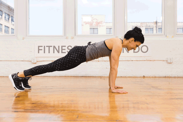 1.Kezdésképpen helyezkedj el úgy, hogy térdeid a talaj felé nézzenek, karjaid pedig vállszélességben helyezkedjenek el, és pontosan a vállaid alatt támaszd meg magad velük. Egyenesítsd ki lábaidat és tartsd meg magad a karjaiddal.