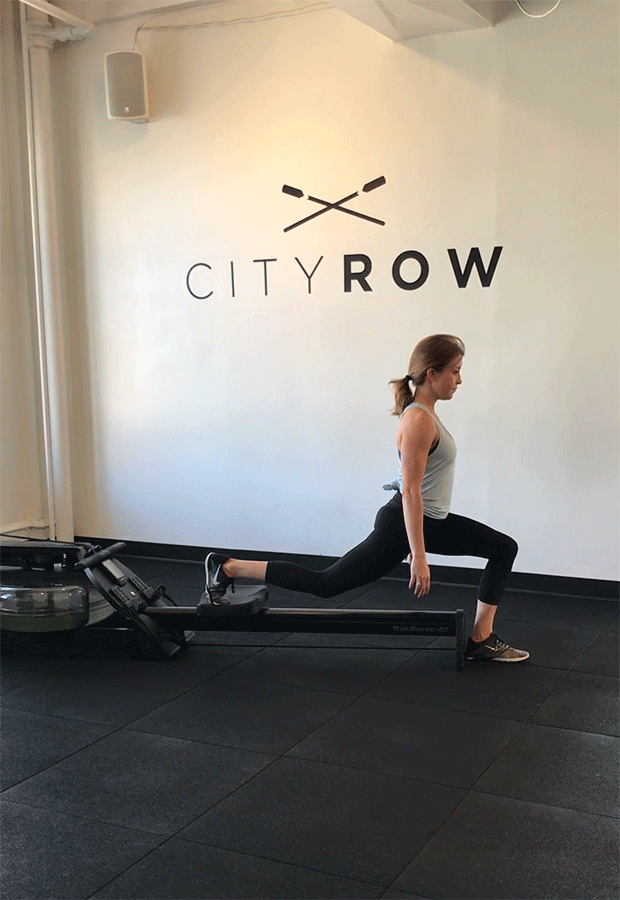 2.Az elülső sarkadat a talajon tartva ereszkedj kitörésbe, közben pedig ereszd le a hátsó térdedet a talaj felé.