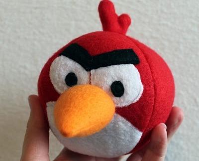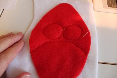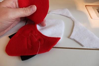 Az egyik piros darabot helyezd a madár feje tetejére és a jobb oldalon varrd oda. Majd varrd össze a másik 2 darabot is. Most a madár 2 darabból áll.