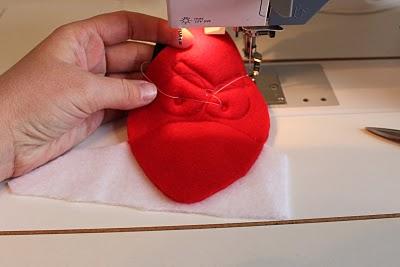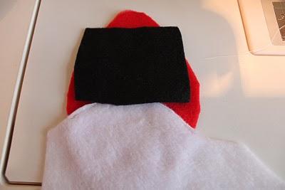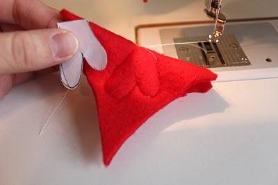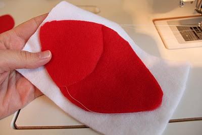 A kép tetején lévő piros és fehér darabokból lesz a bóbita. Mivel a filc nyúlik, mindig balról jobbra haladjunk a varrással.