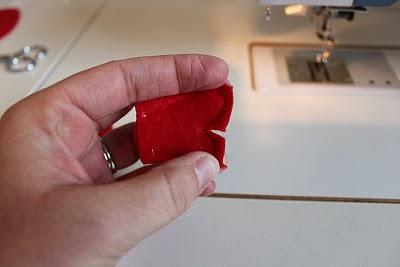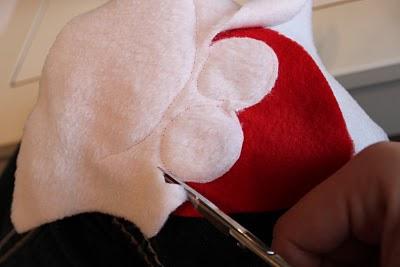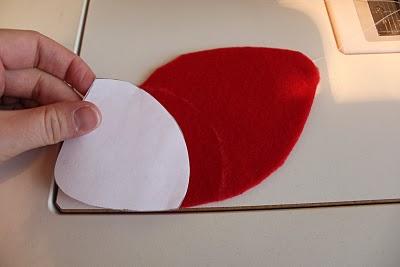 Illeszd össze a fehér filc alsó felét a piros anyaggal és távolítsd el a kilógó pirosat, ahogy a képen látszik.