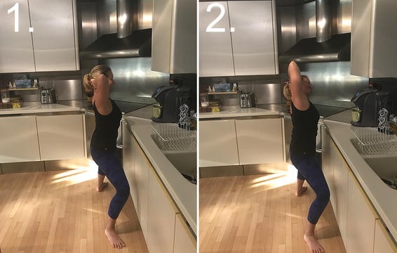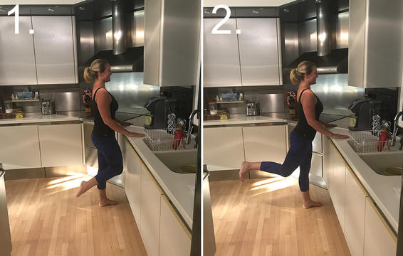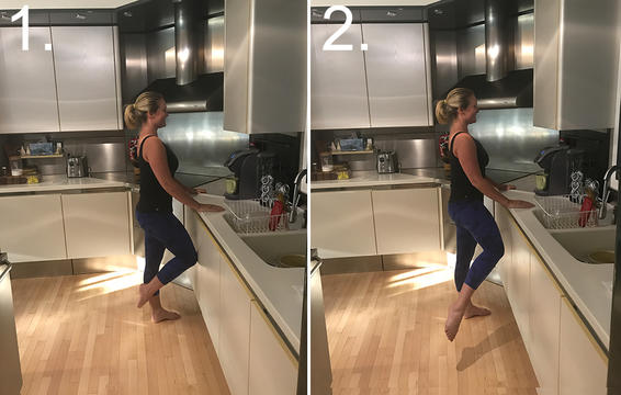 3.Végezz 30-40 sarokemelést, és próbáld picit lejjebb ereszteni magad guggolás közben, még akkor is, ha a végén már remegnek egy kicsit a lábaid (a pult segít!)
