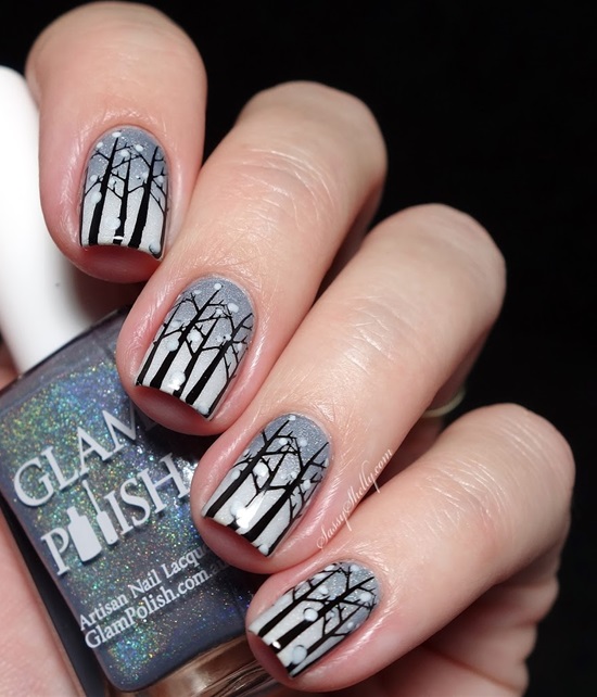 Varázsolj egy gyönyörű, téli tájat a körmeidre! A körmök alapja egy szürke-fehér ombre lesz, erre pedig egy vékonyabb ecsettel könnyedén ráfesthetsz néhány fát.