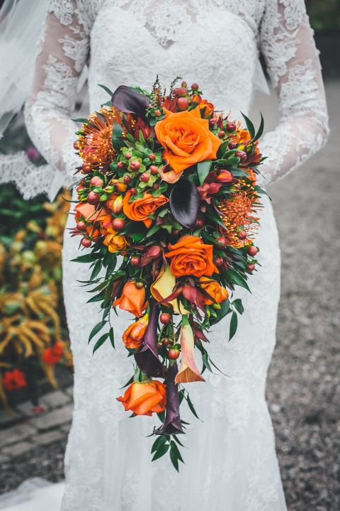 Ilyen drámaian még sosem láthattad az ősz meghatározó színeit egy csokorban! A narancs rózsák rikítóan kitűnnek a csokor visszafogottabb zöld és fekete virágai közül.