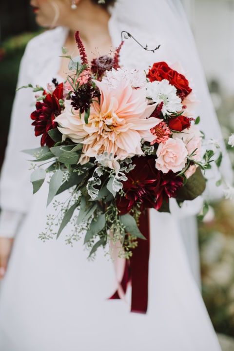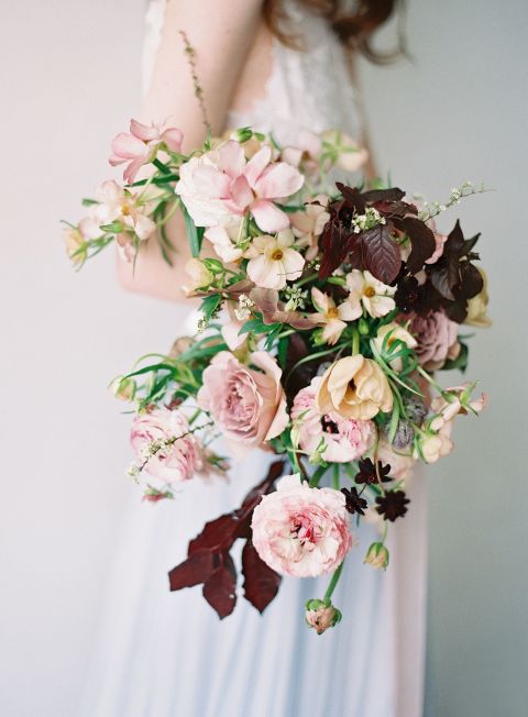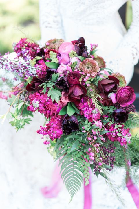 A romantikus esküvői hangulatért válassz egy rózsákból, szederből és bíborkákból álló érzéki csokrot.