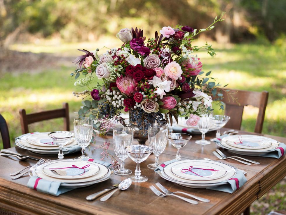 A tökéletes szabadtéri hangulat érdekében próbálj ki egy világos és sötét virágok kontrasztjával és egy csipetnyi zölddel díszített asztali összeállítást. Ez a darab például kívül fehér, belül fekete szellőrózsák, agonis, padlizsánszínű kálák, barackszínű rózsák, babakék eukaliptusz és szomorú kőtiszafák felhasználásával készült.