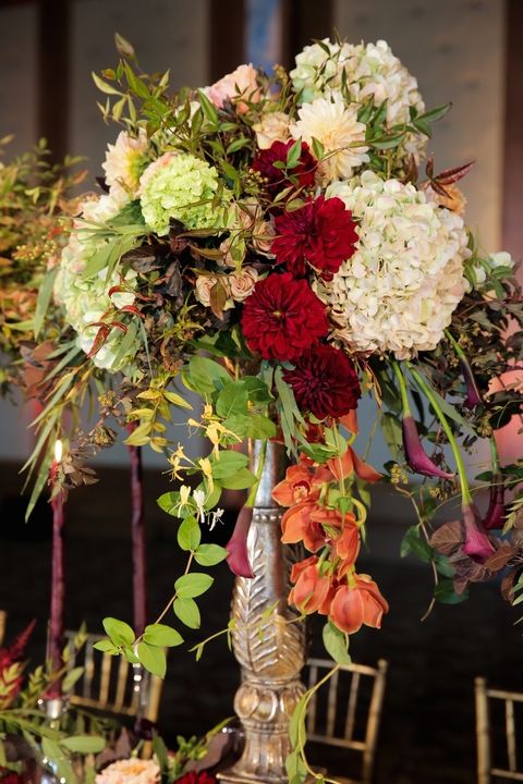 Ez a magas őszi központi darab az antik zöld hortenziák, burgundi dáliák, fekete kálák, Campanella kerti rózsák, „Cafe au Lait” dáliák, lonc indák, japán szentfa, angol tearózsák és a csónakorchideák miatt ilyen pompás.