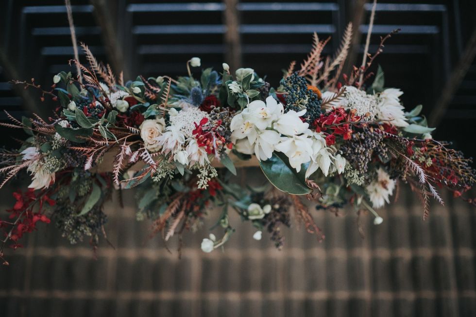 Minden tekintet a trópusi király proteára szegeződik, amikor előkerül ez a beszédes esküvői csokor. A luxus virágot burgundi vörös dáliák, ördögszem virágok, boglárkák, a „kenguru talpakként” emlegetett „Anigozanthos manglesii”, és néhány eukaliptusz és tealevél veszik körül.