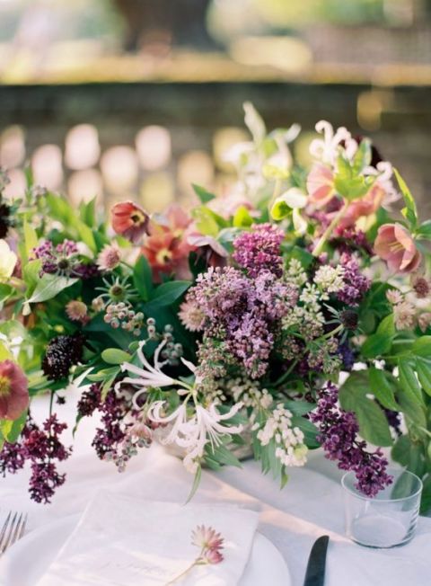 A gazdag zöld levelek és az orgona, hunyor, pirosliliom, nagy völgycsillag, golgotavirág, ördögszem és fagyal tökéletesek egy őszi asztali összeállítás közepére.