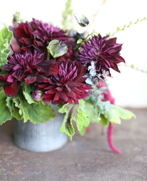 Egy szemet gyönyörködtető „Cafe au Lait” dália alkotja a központi részét ennek a modern, sötét borszínű őszi csokornak. Az összeállításban találunk továbbá „Black Knight” ördögszemeket, fehér ördögszemeket, eukaliptuszt, disznóparéjt, orvosi zsályát és klematisz indákat.