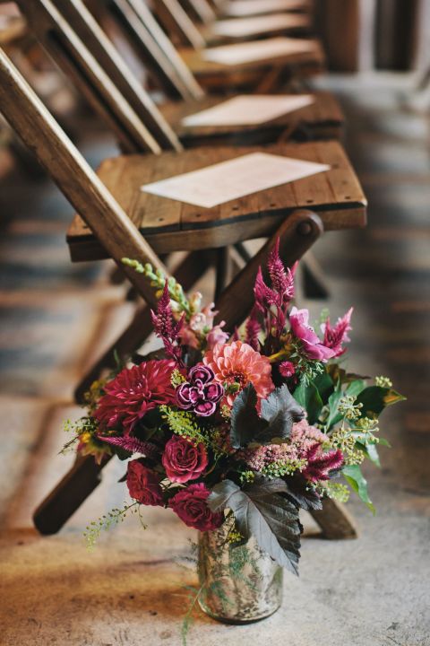 Díszítsd fel a templom folyosóját – helyezz minden sor végére néhány szépséges virágot. Ebben a példában sötét zöldek és világosabb virágok, úgymint rózsaszín dáliák, kerti szegfűk és oroszlánszájak biztosítják az ünnepi hangulatot a nagy napra.