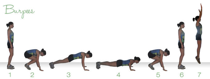 Állj meg egyenesen, a lábaid legyenek szorosan egymás mellett. Guggolj le egy kicsit és tedd a kezed a földre, majd ugorj hátra a lábaiddal, úgy hogy egy fekvőtámasz pozícióban legyél. Ugorj vissza a lábaddal a két kezedhez, majd ugorj fel a levegőbe kinyújtott karral, olyan magasra, amilyenre csak tudsz. Landolj óvatosan, majd azonnal kezd el a következőt. Csináld 30 másodpercig. Ezt ismételd meg négyszer.