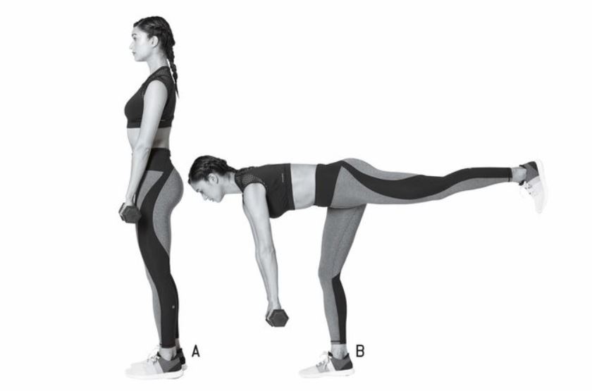 - Dőlj előre a csípődnél 90 fokban, miközben az egyik lábadat magad mögé emeled úgy, hogy a felemelt lábadtól a fejed tetejéig párhuzamos legyen a tested a padlóval. A karjaid közben lógjanak lefelé, és egy lábaddal tartsd meg magad.