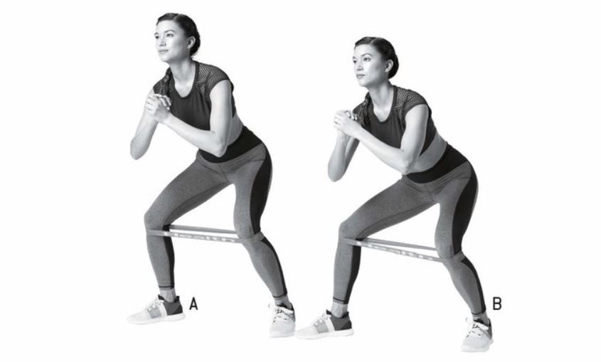 - Kezdj el guggolni, 90 fokos térdhajlítással. Kihívás: amikor visszaemelkedsz a guggolásból, ugorj fel egy kicsit, de ügyelj arra, hogy leérkezéskor ne terheld meg a térdeidet.