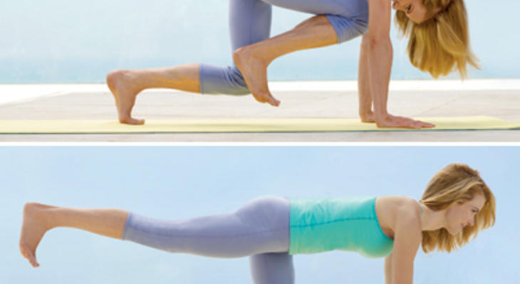 - Tartsd feszítve a hasizmod, hozd a jobb térded az orrodhoz (ahogy a képen). Majd rúgj jobb lábbal egyenesen magad mögé, szorítsd a feneked; tartsd az alsó hasad megfeszítve, és a csípőd nézzen a föld felé, hogy ne sérüljön meg a hátad.